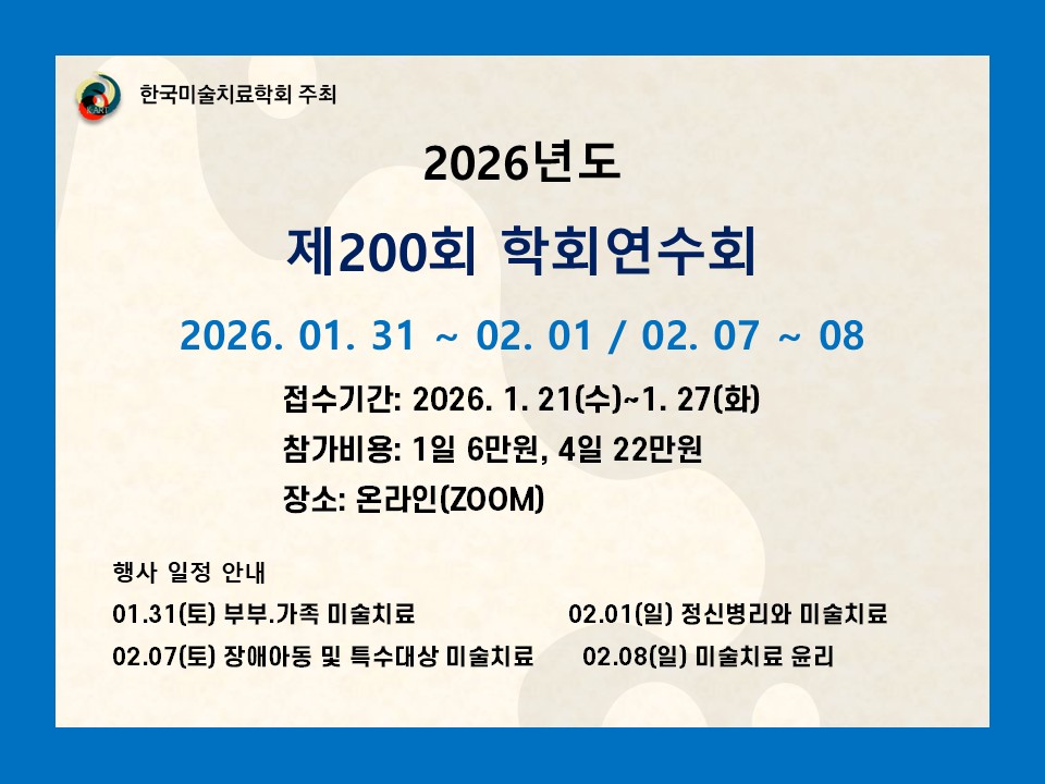 | 제200회 부부·가족 미술치료(토) 연수회 | Zoom | 01.31~01.31 | 01.21~01.27 | 신청하기 |