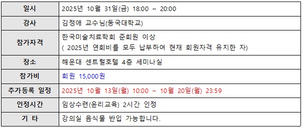 2025년 하반기 윤리교육이 10월 31일(금) 부산 해운대 센트럴 호텔에서 개최될 예정입니다. 자세한 내용은 아래의 공지를 참고해주시기 바랍니다. ![]() [사전등록 안내] ① 온라인 신청 - 한국미술치료학회 홈페이지(http://www.korean-arttherapy.or.kr) 로그인 후, 메인화면의 우측 하단 [주요행사 신청]-[2025년 하반기 윤리교육 신청하기] 클릭 ② 신청이 완료 된 후 입금 계좌로 등록비 입금 - 입금처: IM뱅크 009-10-004481 (예금주: (사)한국미술치료학회) - 입금 시 반드시 신청인+생년월일(예: 홍길동801011)으로 입금해주시기 바랍니다. - 신청자와 입금자명이 다를 경우 입금 확인이 어려우므로 학회 메일(ko-arttherapy@hanmail.net) 로 내용을 기재하여 확인 요청을 바랍니다. - 입금 후 3-5일간 입금확인이 되지 않을 경우 입금자명/입금액/입금일시/입금계좌를 기재하여 학회 메일(ko-arttherapy@hanmail.net)로 보내주시기 바랍니다 ※ 위 2가지 모두 수행 후 접수가 완료됩니다. [취소 및 환불신청기간] - 행사 접수기간 내 취소 시 100% 환불, 접수 종료 후 행사시행일 7일 전 취소 시 50% 환불, 그 이후에는 환불 불가 - 등록 취소 방법: 학회 메일(ko-arttherapy@hanmail.net)로 접수 (메일 제목을 [윤리교육 등록 취소 접수]로 하여 메일 내용에 신청인/생년월일/환불 계좌를 기재하여 발송) - 환불은 행사가 끝난 후 일주일 후 일괄 처리됨. [숙박 안내] 인터넷 예약 - 아래 링크를 클릭하면 할인된 가격으로 학술대회가 열리는 해운대 센트럴 호텔 이용이 가능합니다. https://booking.naver.com/booking/3/bizes/559637/items/7085499?area=plt - 2박 예정일 경우 10월31일과 11월2일을 선택해 주시기 바랍니다. 전화 예약 - 010-8969-3997 (카드번호와 유효기간이 있으면 실물카드없이 결제 가능) (사)한국미술치료학회