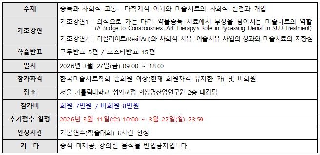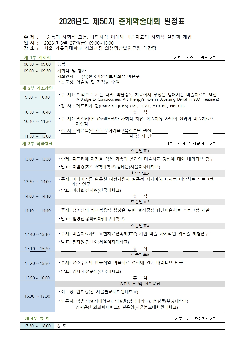 2026년 3월 27일(금) 서울 가톨릭대학교 성의교정 의생명산업연구원에서 진행하는 제50차 춘계학술대회 추가접수를 3월 11일(수)~3월 22일(일)까지 실시할 예정입니다. 자세한 내용은 아래의 공지 및 첨부된 공문을 참고해주시기 바랍니다. * 2026년도 상반기 윤리교육은 4월 18일(토) 18:00~20:00, 화상 ZOOM으로 진행될 예정입니다. 참가를 원하시는 회원님께서는 이점 참고 바랍니다. ![]() ![]() [사전등록 안내]