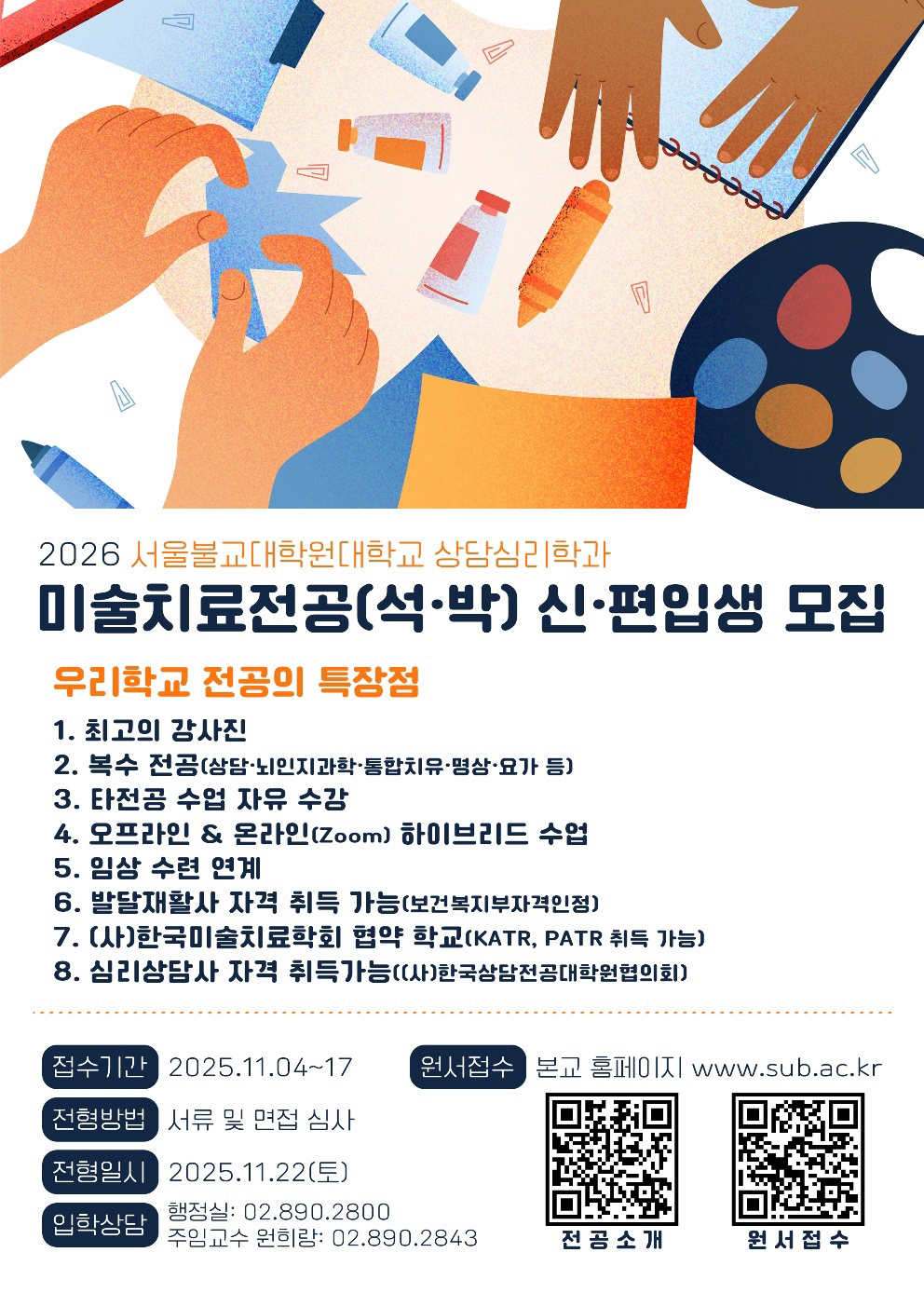 - 상담심리학과 소속으로 미술치료에 필수적인 이론적 전문성을 다질 수 있음.