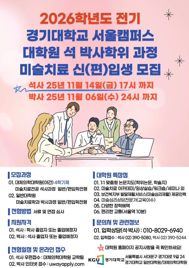♥2026학년도 전기 경기대학교 서울캠퍼스 석사, 박사학위 과정 미술치료 신(편)입생 모집♥