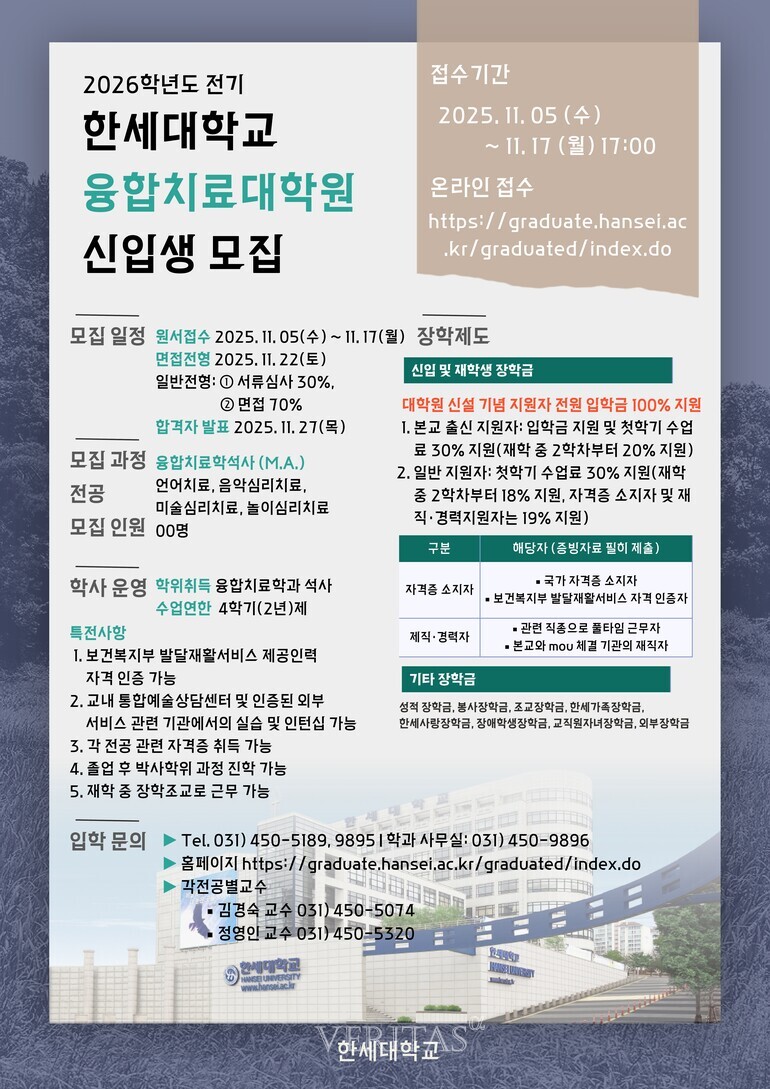 **한세대학교 융합치료대학원 미술심리치료 석사과정 신입학 안내(입학금 100%지원)**