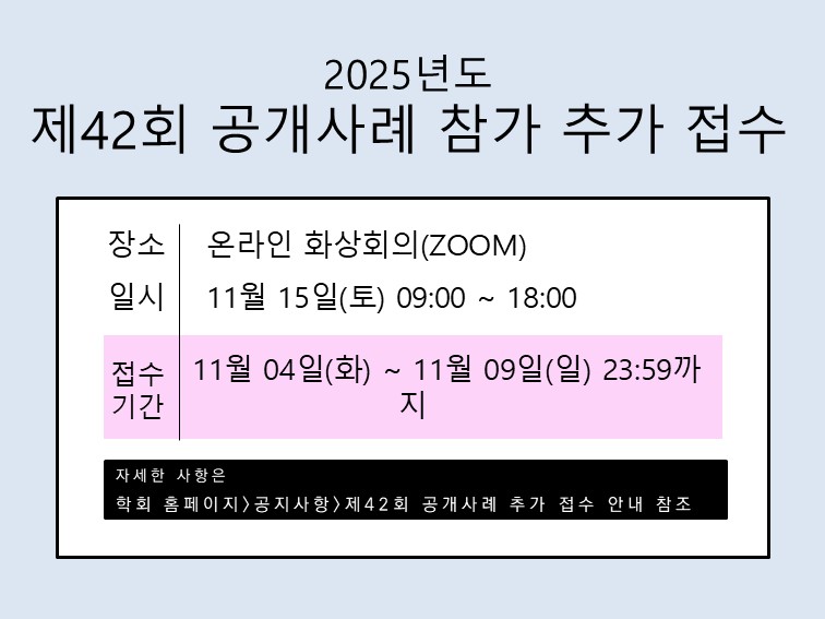 | 2025년도 제 42회 공개사례 참가 접수 안내 | Zoom | 11.15 | 10.13~11.09 | 신청하기 |