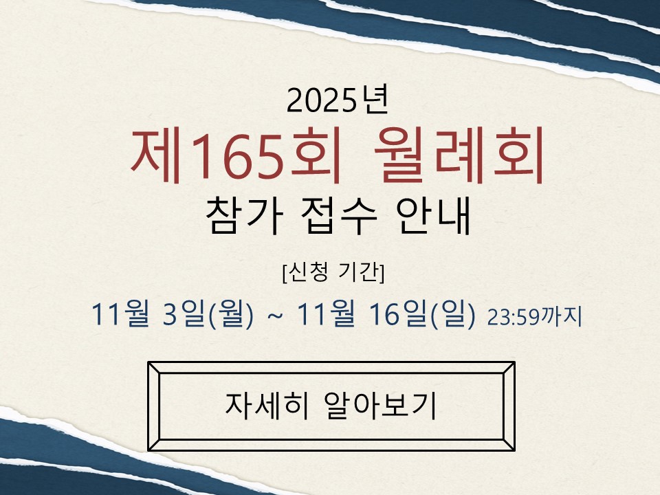 | 2025년도 제 163회 월례회 참가접수 안내 | Zoom | 12.06 | 11.03~11.16 | 신청하기 |