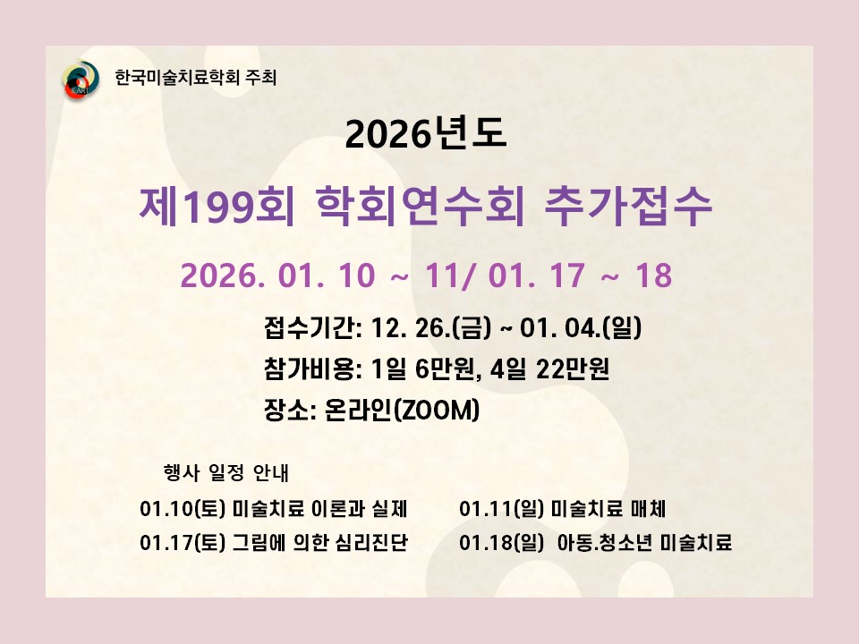 | 제199회 아동·청소년 미술치료(일) 연수회 | Zoom | 01.18 | 12.26~01.04 | 신청하기 |
