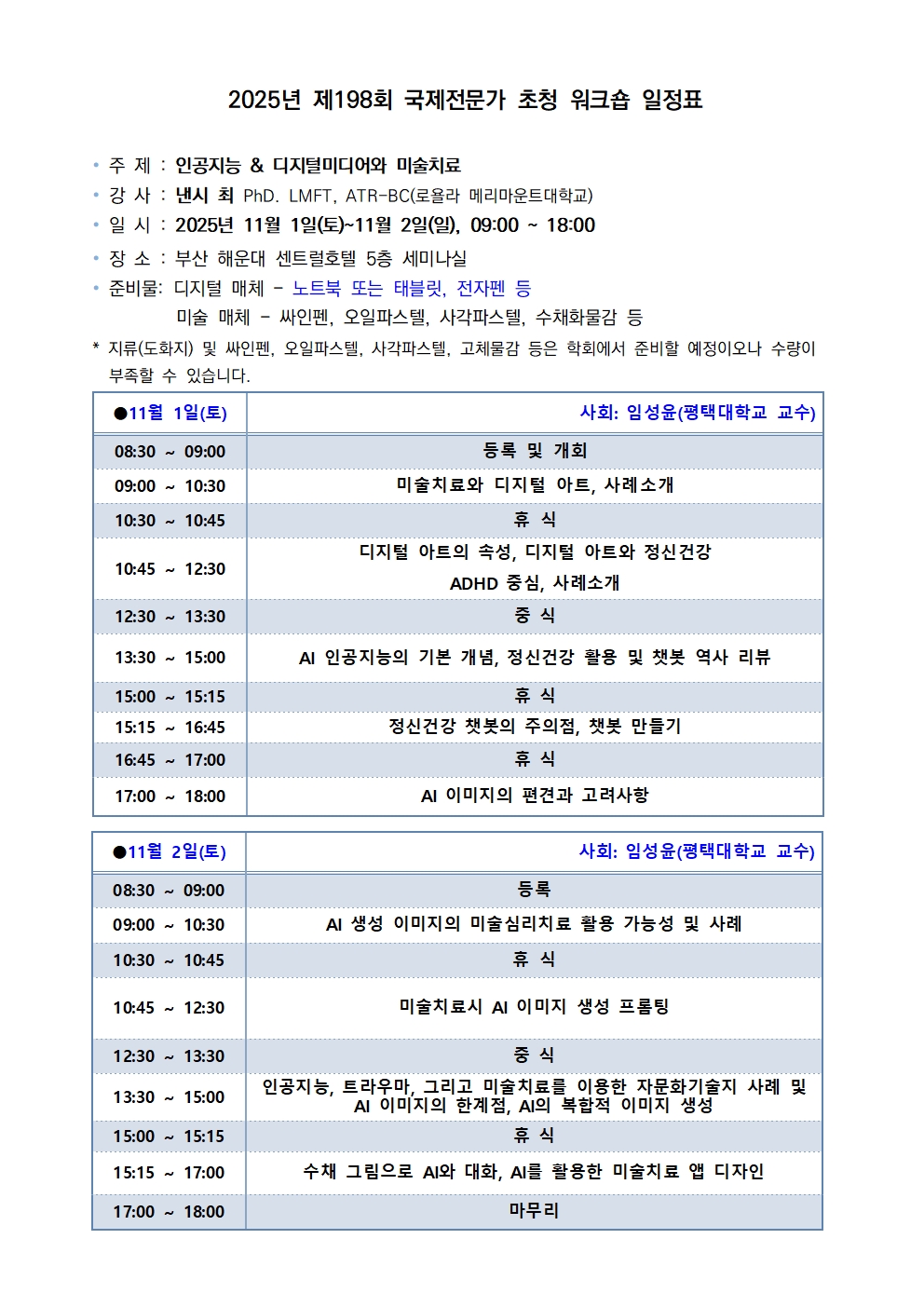 제198회 국제전문가초청워크숍을 11월 01일(토) ~ 11월 02일(일) 부산 해운대 센트럴 호텔에서 진행할 예정입니다. 자세한 내용은 아래의 공지를 참고해주시기 바랍니다. ![]() ![]() * 일정표는 사정에 따라 변경될 수 있습니다.. [사전등록 안내] ① 온라인 신청 - 한국미술치료학회 홈페이지(http://www.korean-arttherapy.or.kr) 로그인 후, 메인화면의 우측 하단 [주요행사 신청]-[제198회 국제전문가초청워크숍 신청하기] 클릭 ② 신청이 완료 된 후 입금 계좌로 등록비 입금 - 입금처: iM뱅크 009-10-004481 (예금주: (사)한국미술치료학회) - 입금 시 반드시 신청인+생년월일(예: 홍길동801011)으로 입금해주시기 바랍니다. - 신청자와 입금자명이 다를 경우 입금 확인이 어려우므로 학회 메일(ko-arttherapy@hanmail.net) 로 내용을 기재하여 확인 요청을 바랍니다. - 입금 후 3-5일간 입금확인이 되지 않을 경우 입금자명/입금액/입금일시/입금계좌를 기재하여 학회 메일(ko-arttherapy@hanmail.net)로 보내주시기 바랍니다. ※ 위 2가지 모두 수행 후 접수가 완료됩니다. [취소 및 환불신청기간] - 행사 접수기간 내 취소 시 100% 환불, 접수 종료 후 행사시행일 7일 전 취소 시 50% 환불, 그 이후에는 환불 불가 - 등록 취소를 원할 경우, 학회 메일(ko-arttherapy@hanmail.net)로 제목을 [워크숍 등록 취소 접수] 로 하여 내용에 신청인/생년월일/환불 계좌를 기재하여 접수 - 환불은 행사 일주일 후 일괄 처리 [숙박 안내] 인터넷 예약 - 아래 링크를 클릭하면 할인된 가격으로 학술대회가 열리는 해운대 센트럴 호텔 이용이 가능합니다. https://booking.naver.com/booking/3/bizes/559637/items/7085499?area=plt - 2박 예정일 경우 10월31일과 11월2일을 선택해 주시기 바랍니다. 전화 예약 - 010-8969-3997 (카드번호와 유효기간이 있으면 실물카드없이 결제 가능) (사)한국미술치료학회