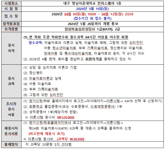 ![]() 2026년도 제34회 임상미술심리상담사(KATR) 이론시험 안내