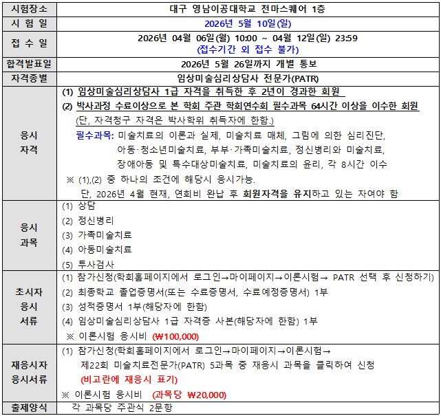 ![]() 2026년도 제22회 임상미술심리상담사 전문가(PATR) 이론시험 안내
