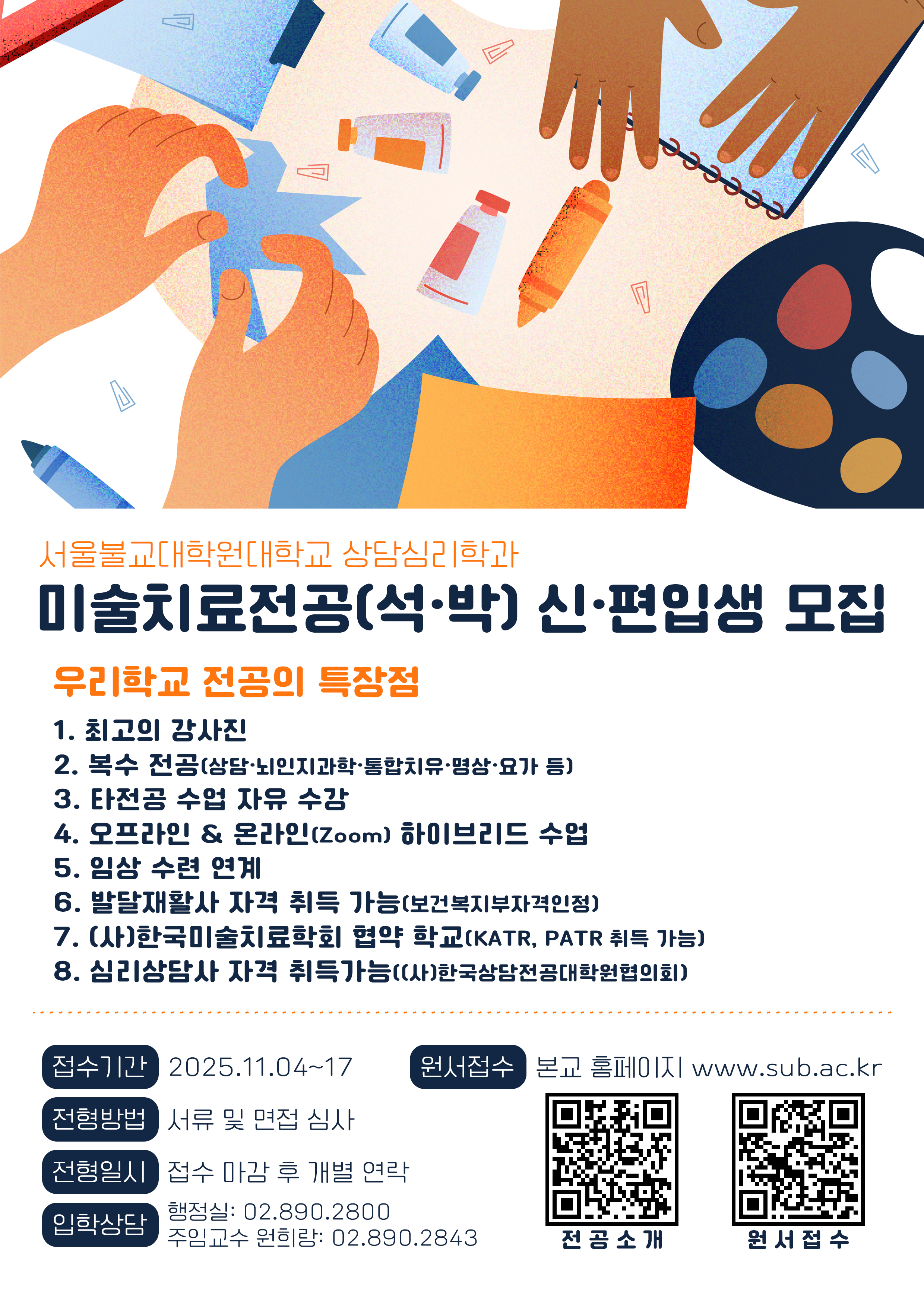 - 상담심리학과 소속으로, 상담이론과 미술치료이론을 함께 학습하며 임상 경험을 쌓을 수 있도록 운영되고 있습니다.