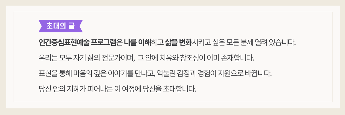 그림, 음악, 움직임, 글쓰기 등 다양한 예술 활동을 통해 자신과 타인의 마음을 이해하고, 비폭력적이고 공감적인 소통의 힘을 경험합니다. 그 과정에서 개인의 치유가 사회 변화로 확장되는, 조용하지만 깊은 흐름을 만나게 됩니다.