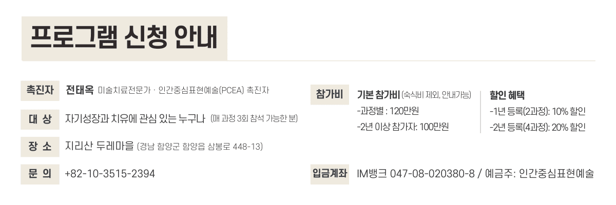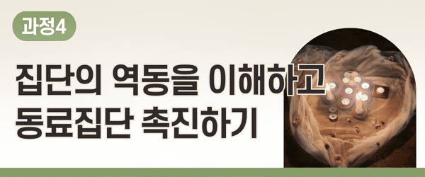 앞의 세 과정이 개인의 성장과 치유에 초점을 두었다면, 이번 과정은 그 배움을 ‘집단 속으로 확장하는 여정’입니다. 집단을 촉진하는 경험을 통해 나 자신을 더욱 깊이 이해하고 성장하게 됩니다.