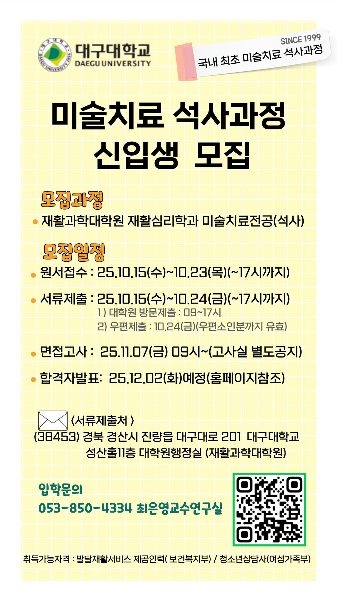대구대학교 재활과학대학원 미술치료(석사) 26학년도 신입생모집