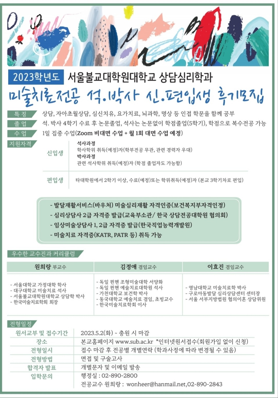 2023학년도 서울불교대학원대학교 상담심리학과 미술치료전공 석,박사 신,편입생 후기모집안내