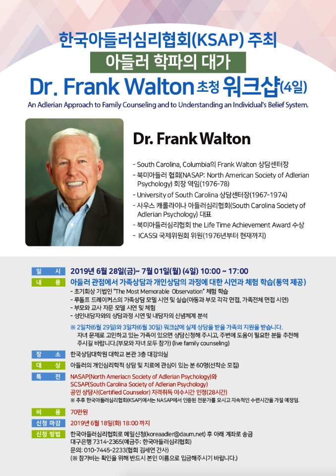 ksap아들러학파의 대가 Dr.FrankWalton 초청 개인(가족)상담 워크샵 안내!!!