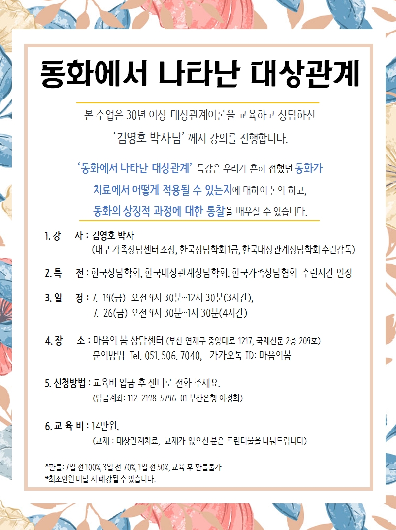 [부산][마음의봄상담센터] 김영호교수님 '동화에서 나타난 대상관계' 모집