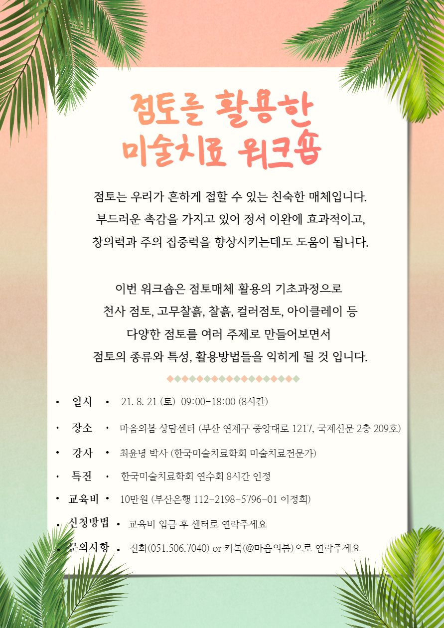[부산/마음의봄상담센터] 8월 21일 점토를 활용한 미술치료 워크숍 인원모집합니다