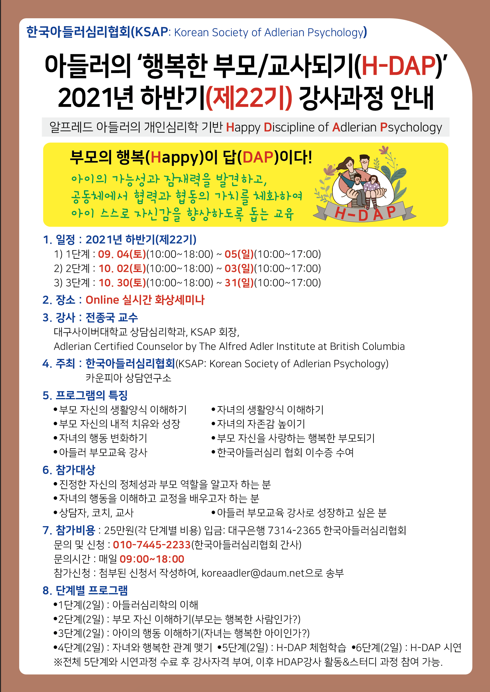 [KSAP] 2021하반기 H-DAP 아들러의 행복한 부모.교사되기 Zoom교육 22기 강사반 개강!