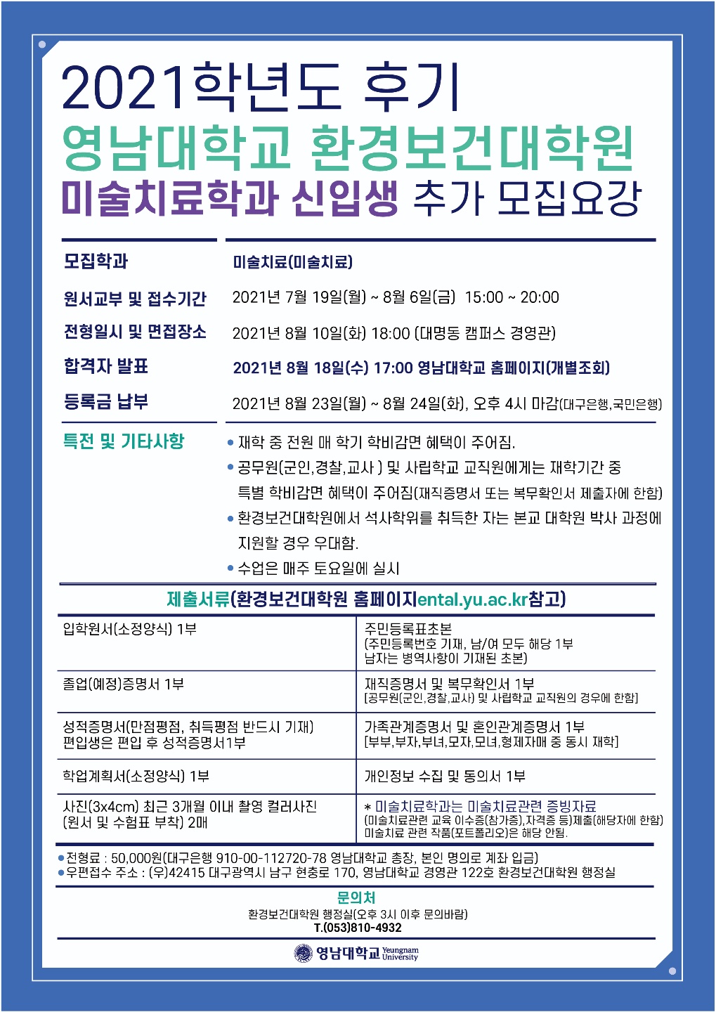 2021학년도 후기 영남대학교 환경보건대학원 미술치료학과 신입생 추가 모집요강