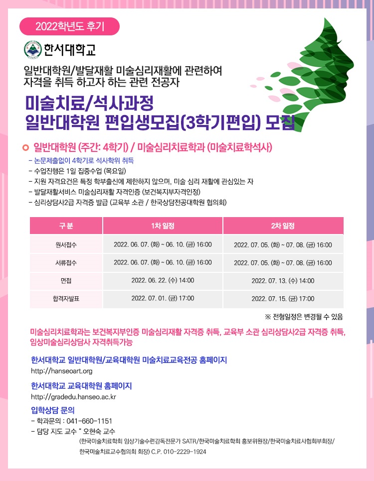 한서대학교 대학원 2022-2 미술치료 발달재활관련하여 편입생모집