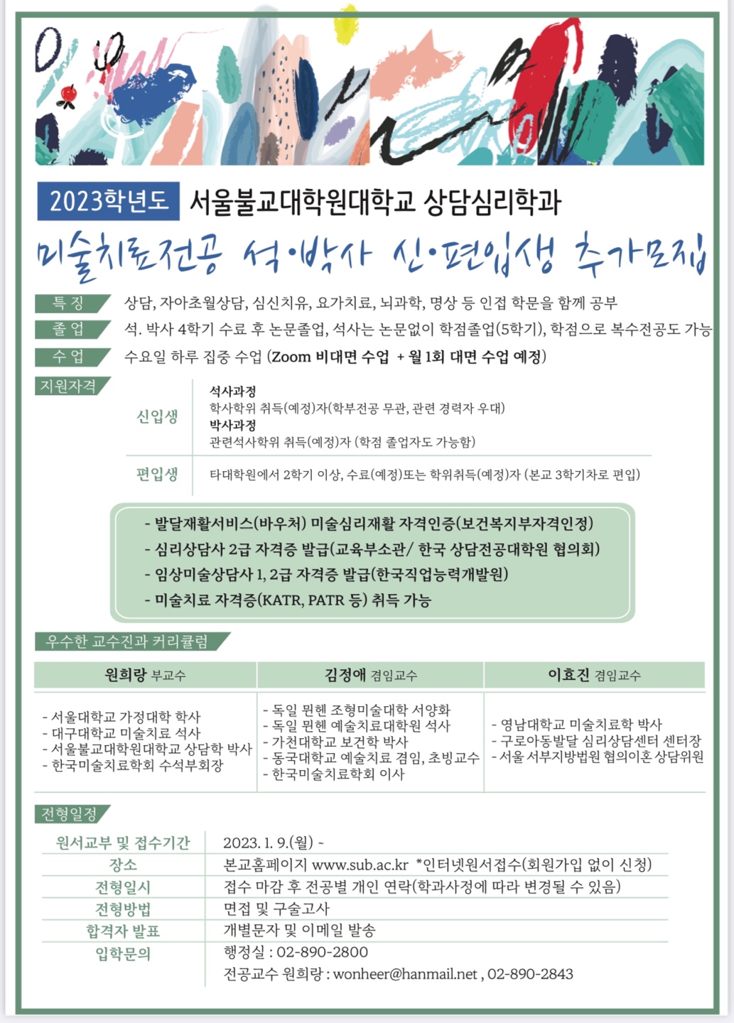 2023년도 서울불교대학원대학교 상담심리학과 미술치료전공 석•박사 신•편입생 추가 모집 안내